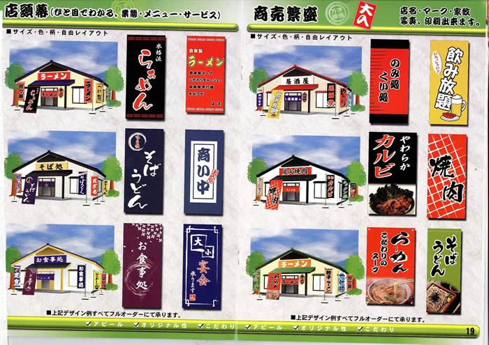 店舗前を低コストに集客アイテムとして永く使われるのれん、のぼりです。置き方、置く場所によってもイメージはガラッと変わりますので、ぜひ相談ください。サンプルブックもございます。カテゴリー範囲で画像メールも送れます。 |