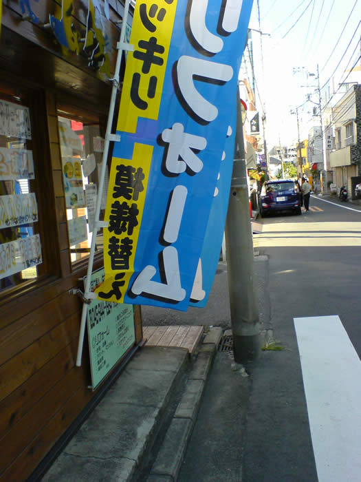 | 当社ののぼりです。壁につけてます。これなら歩道がない店舗などにもってこいの方法です。 |